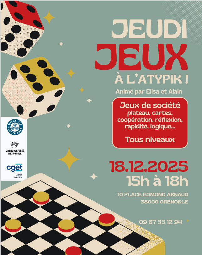Ce jeudi 18 décembre Élisa et Alain vous propose de découvrir (ou pas) de nouveaux jeux (plateau, cartes, coopération, réflexion, rapidité, logique…)